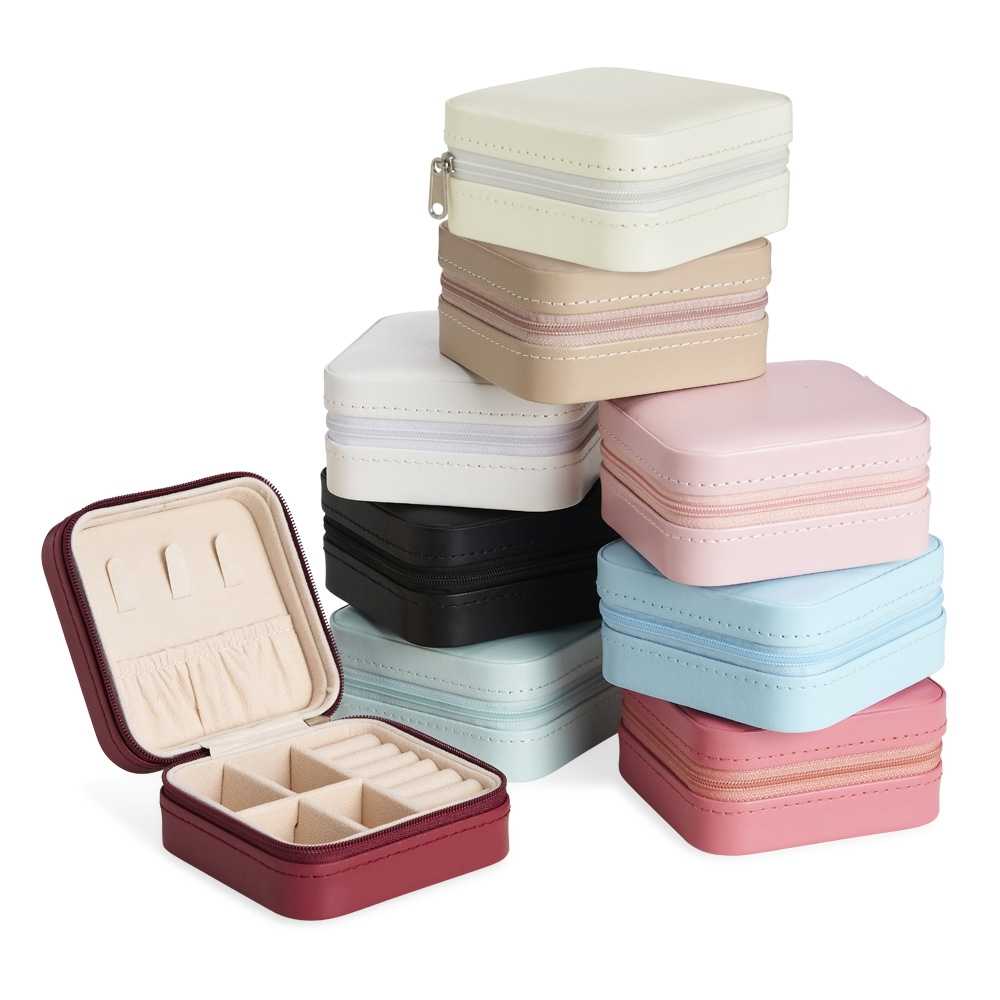 Porta-joias feito em couro sintético com revestimento interno em tecido aveludado.